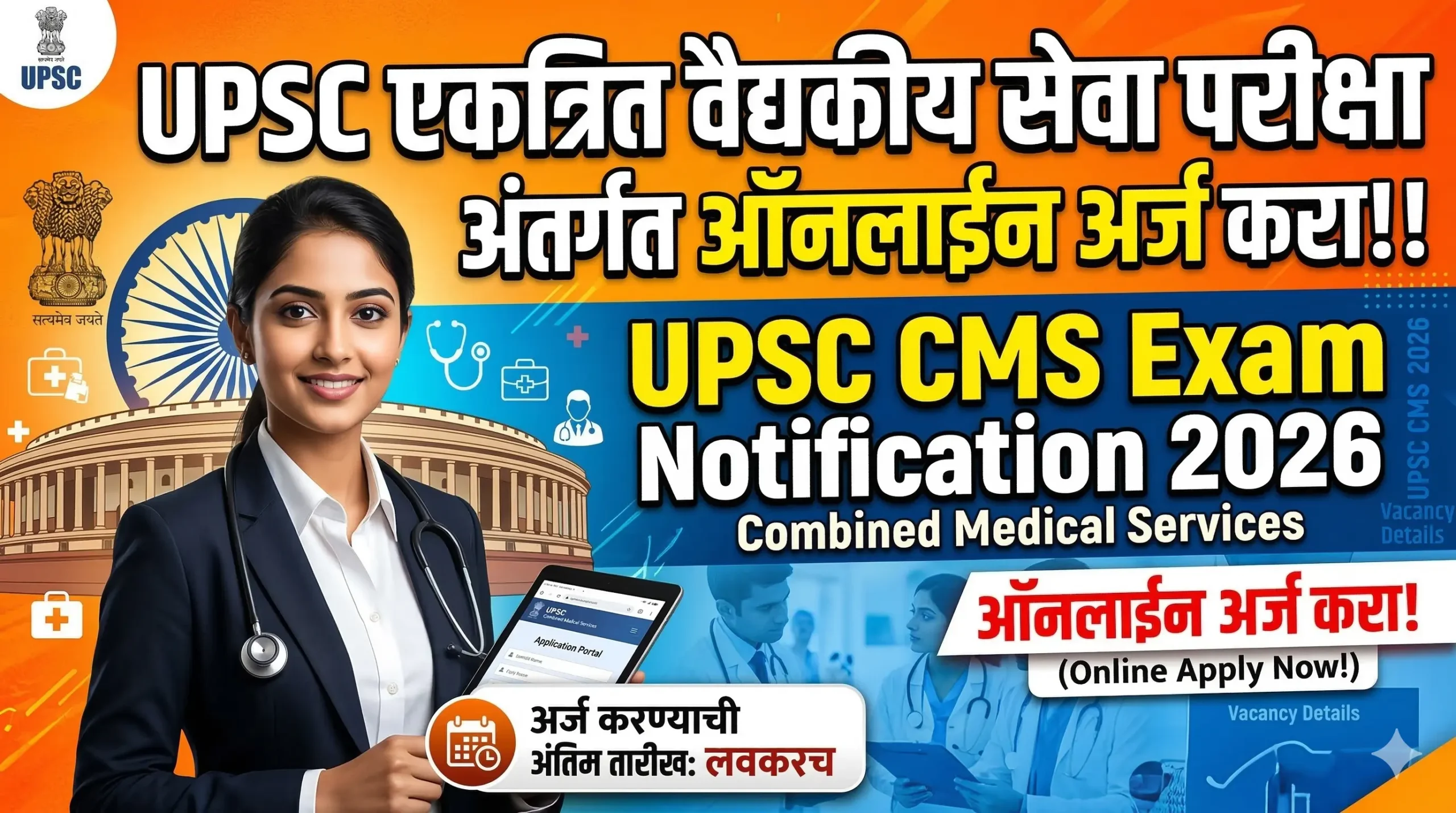 केंद्रीय लोकसेवा आयोग (UPSC) मार्फत संयुक्त वैद्यकीय सेवा परीक्षा 2026 साठी मोठी भरती जाहीर करण्यात आली आहे. या भरतीद्वारे विविध विभागांमध्ये वैद्यकीय अधिकारी पदांसाठी एकूण 1358 जागा भरल्या जाणार आहेत. पात्र आणि इच्छुक उमेदवारांनी ऑनलाईन पद्धतीने अर्ज करायचा आहे.